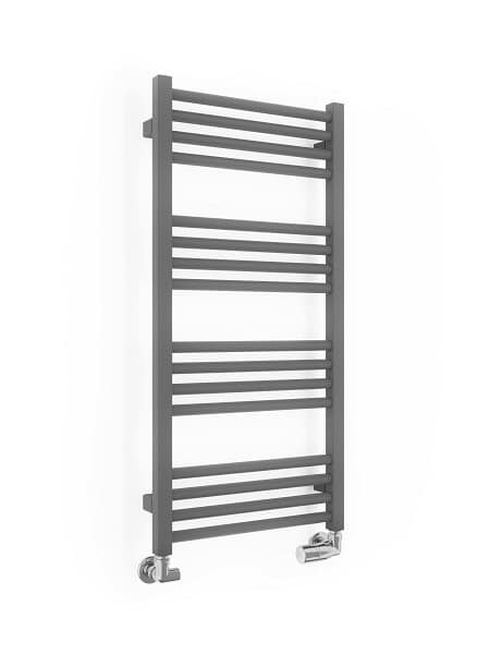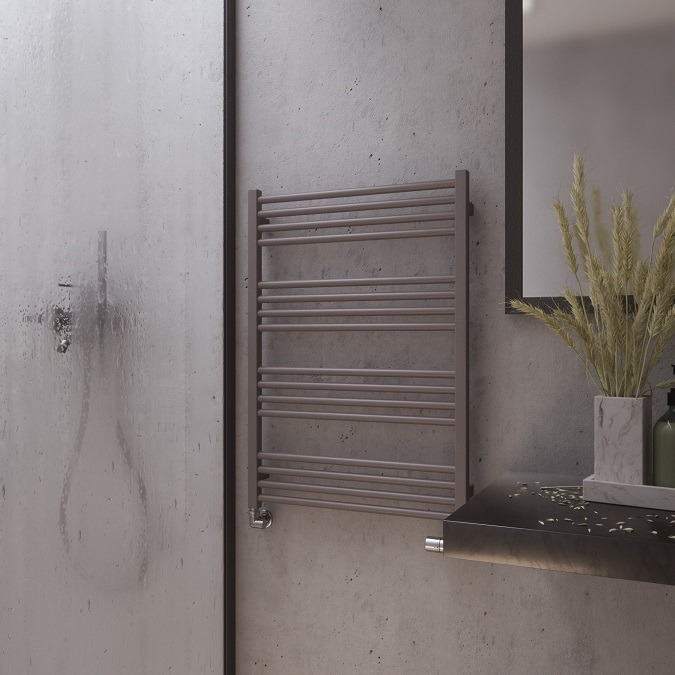 Slank og moderne håndklædetørrer i mat antracit pulverlak (RAL 9005) med 30×30 mm lodrette samlere og Ø 22 mm rund-formede vandrette rør – skabt til at give et stilrent, åbent udtryk og optimal pladsudnyttelse.