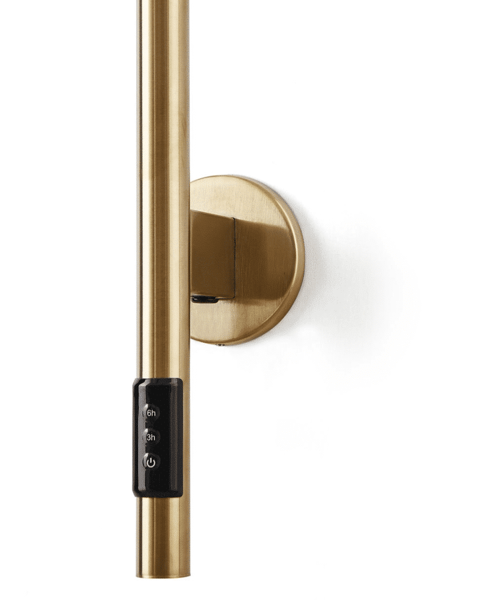 Minos elektrisk håndklædetørrer i børstet messing kombinerer et slankt, lodret design med en varm, mat overflade, der tilfører et eksklusivt touch til badeværelset.