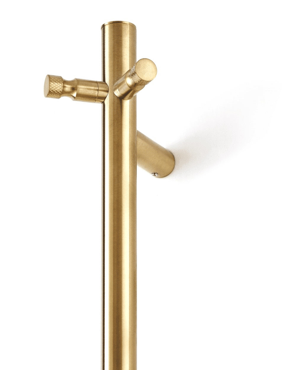 Materiale & Finish: Rustfrit stål med mat børstet messingbelægning og “crystal cut” detaljer på kroge